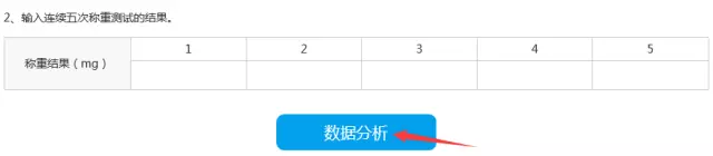 6.根據移液器校準指南操作,讀取天平讀數,輸入下示表格,并點(diǎn)擊藍色按鈕“數據分析”。