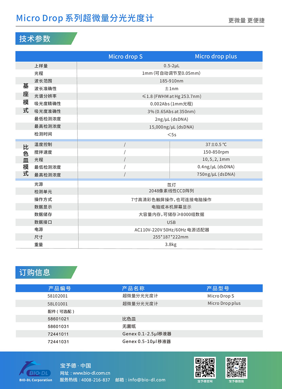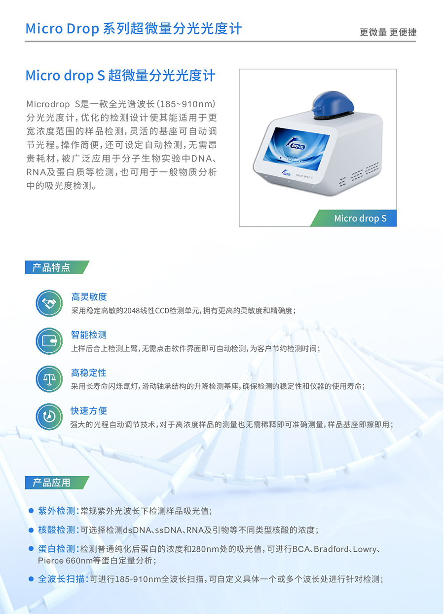 Microdrop plus超微量分光光度計是寶予德Microdrop的升級款,體積小巧,方便放置于各種空間能快速準確地檢測微量(0.5-2uL)樣品中目標物質(zhì)的吸光值,波長(cháng)掃描范圍廣,通過(guò)其寬闊的觸摸屏可以輕松簡(jiǎn)單地進(jìn)行操作。它具有多種檢測模式,能夠輕松應對不同檢測實(shí)驗室中對樣本中DNA/RNA/蛋白質(zhì)等生物分子物質(zhì)的吸光度檢測。