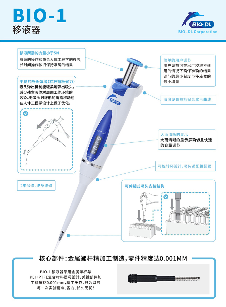 移液器Bio-1特選精良的材質(zhì),具有出色的耐化學(xué)腐蝕性和抗紫外線(xiàn)性能,可伸縮式圓錐管嘴和滑輪式吸頭彈出器使吸頭更容易裝配和彈出,四位數字顯示窗,為移取各種類(lèi)型液體提供更精確的結果。涵蓋0.1μ1-10ml單道量程及0.5u1-300ul多道量程。